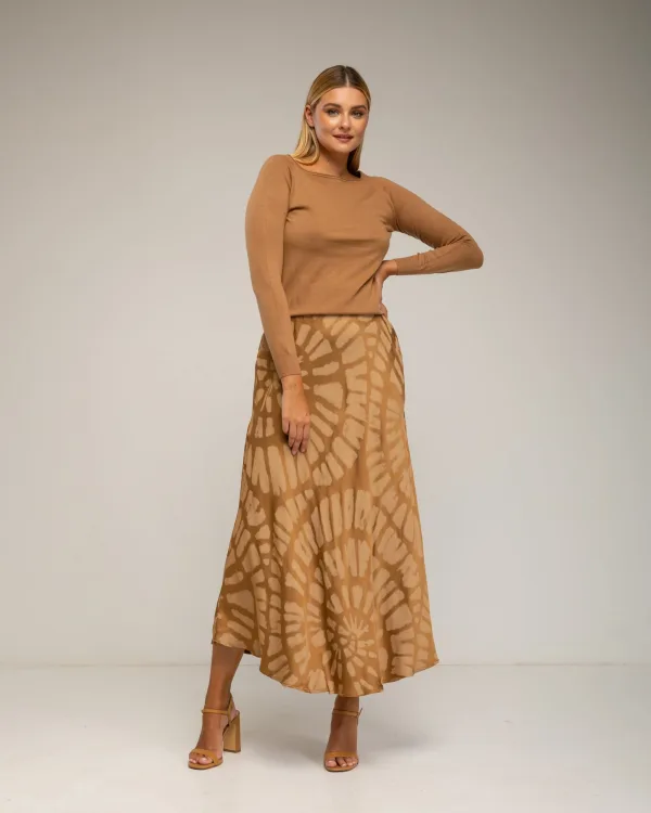 Midi-jurk met zijde, geometrische print, uitlopende stijl, zakken en elastische tailleband