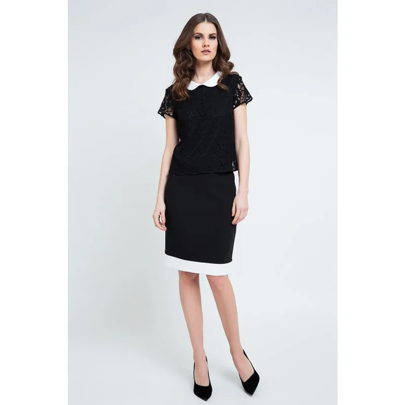 Midi kokerrok van geweven stof met een lichte stretch. Band van 4 cm van pleer. Plooien onder de tailleband vooraan en 2 achteraan voor een perfecte pasvorm. Contrasterende crèmekleurige zoom van 6 cm. Dikke zwarte ritssluiting van 18 cm achteraan. Split van 12 cm achteraan. Gevoerd. Roklengte voor maat 38: 64cm.