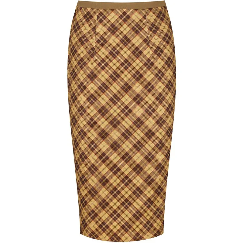 Deze midirok met print is gemaakt van gabardine. Het heeft een effen beige tailleband met figuurnaden onder voor- en achterkant. Hij sluit aan de achterkant met een goudkleurige metalen rits. De rok heeft een split aan de achterkant en is volledig gevoerd.