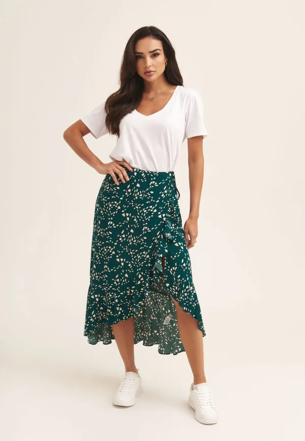 Deze midi-rok met overslag met dierenprint en ruches geeft een moderne draai aan de conventionele midi-rok met ruches aan één lijn, een wikkelontwerp en een zwierige vorm. Voeg deze opvallende midi toe aan je werkkledinggarderobe!