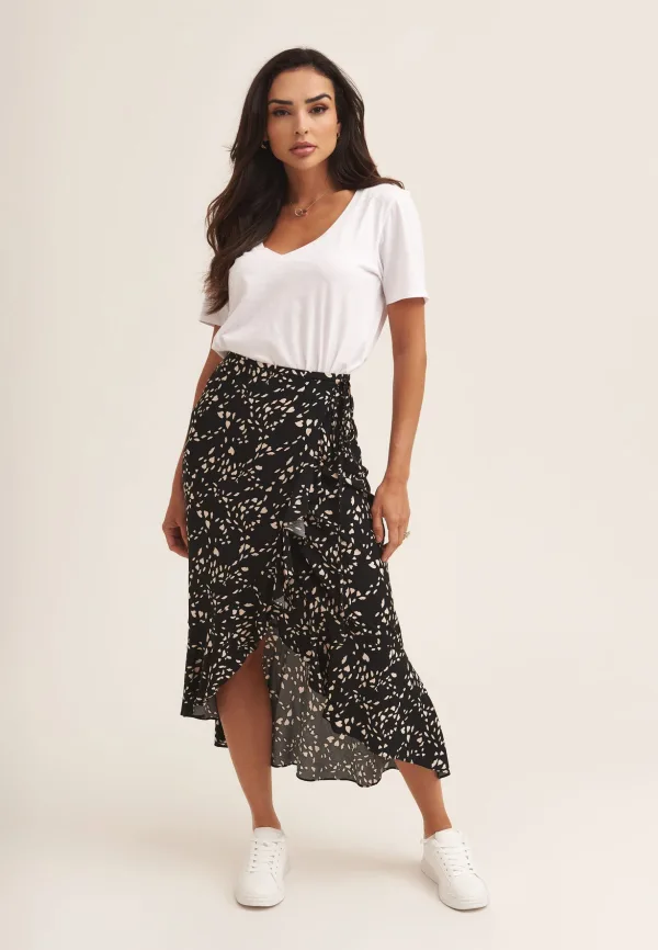 Deze midi-rok met overslag met dierenprint en ruches geeft een moderne draai aan de conventionele midi-rok met ruches aan één lijn, een wikkelontwerp en een zwierige vorm. Voeg deze opvallende midi toe aan je werkkledinggarderobe!