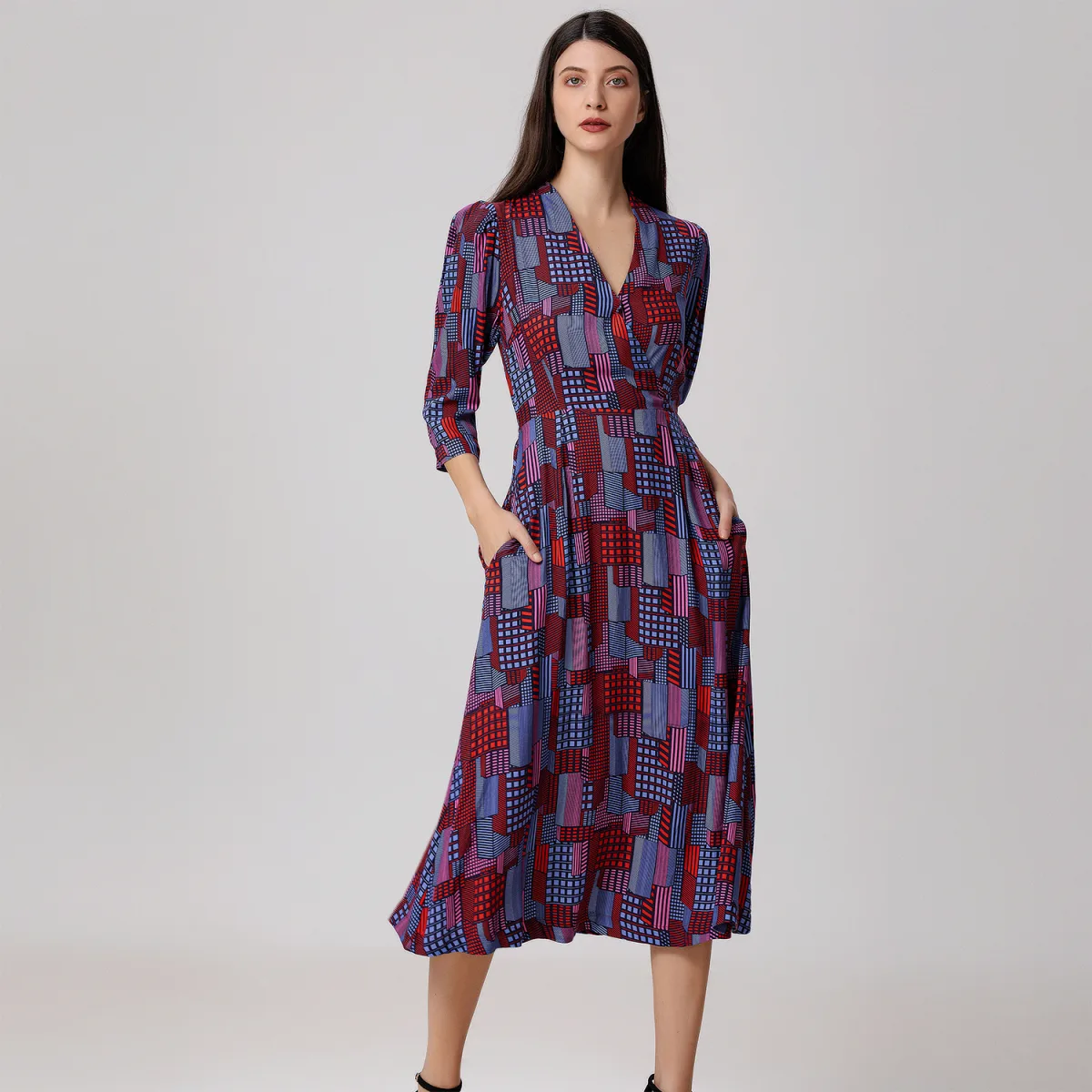 Een minimalistisch en soepel kledingstuk met een gekruist harteffect en een aansluitende taille die het silhouet op elegante wijze accentueert. Een grafische en vrouwelijke jurk met een geometrische patroonprint, geschikt voor alle seizoenen voor semi-formele stadsgelegenheden, op kantoor of 's avonds, voor cocktails. Productdetails: Vorm: wijd uitlopend, getailleerd in de taille Lengte: 122 cm V-hals 3/4 mouwen Elastiek in de taille aan de achterkant/stuk om aan te trekken