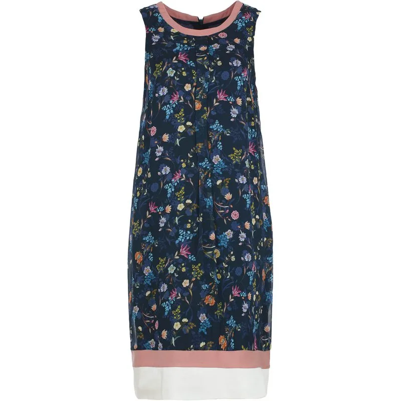 Deze viscose jurk in middernachtstuin is gemaakt van geweven stof. Hij is mouwloos en heeft een ronde halslijn. De halslijn is afgewerkt met een goudkleurige bies. De jurk sluit op de rug met een blinde ritssluiting. Er is een kleine split van 14 cm aan de achterkant. Het kledingstuk heeft een subtiel A-lijn silhouet en is volledig gevoerd.