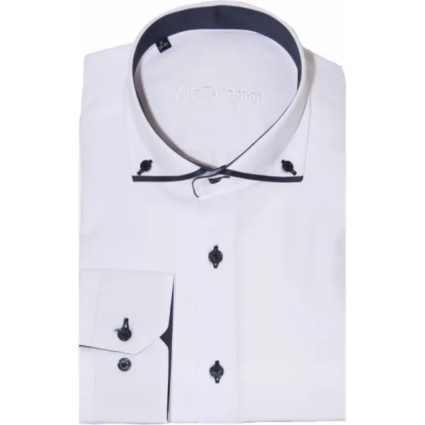 Mooi heren overhemd van Mike Turnham met lange mouwen. Dit vlotte heren overhemd heeft een contrast rand aan de kraag en in de boord en manchetten. Modern fit 67% Katoen/ 33% Polyester