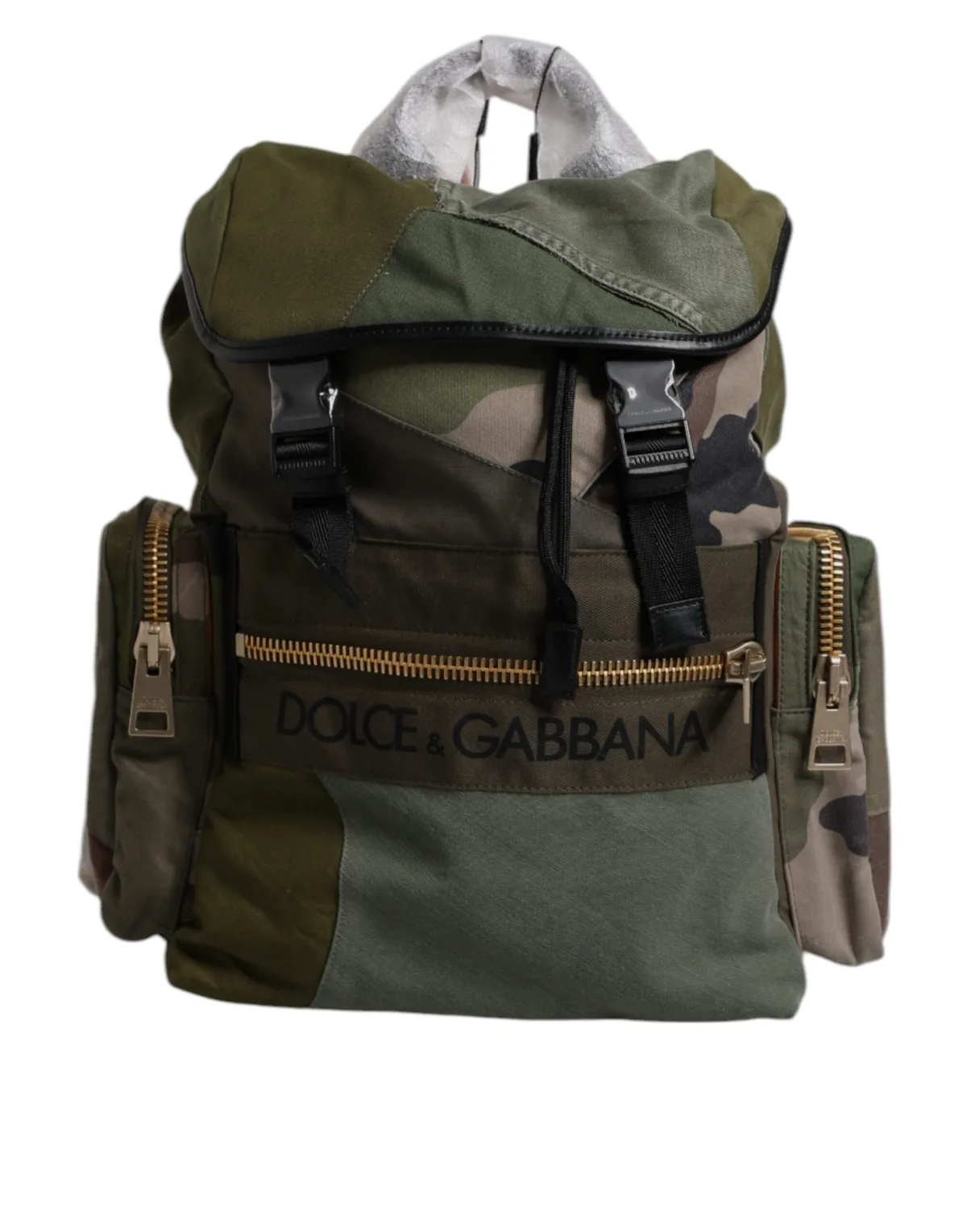 DOLCE & GABBANA Prachtige gloednieuwe, 100% Authentieke Dolce & Gabbana rugzak met een grote, effen weefsel, merklogo, camouflage, trekkoordsluiting, volledig gevoerd, interne zakken met trekkoord. Model: Rugzak Kleur: Militair Groen Materiaal: 80% Katoen 10% Kalfsleer 10% Nylon Stof binnenvoering Trekkoordsluiting Logo-details, logo gegraveerde metalen hardware Gemaakt in Italië Zeer exclusief en van zeer hoge ambachtelijke kwaliteit Afmetingen: 38cm x 40cm x 13cm Band: 90cm x 6cm