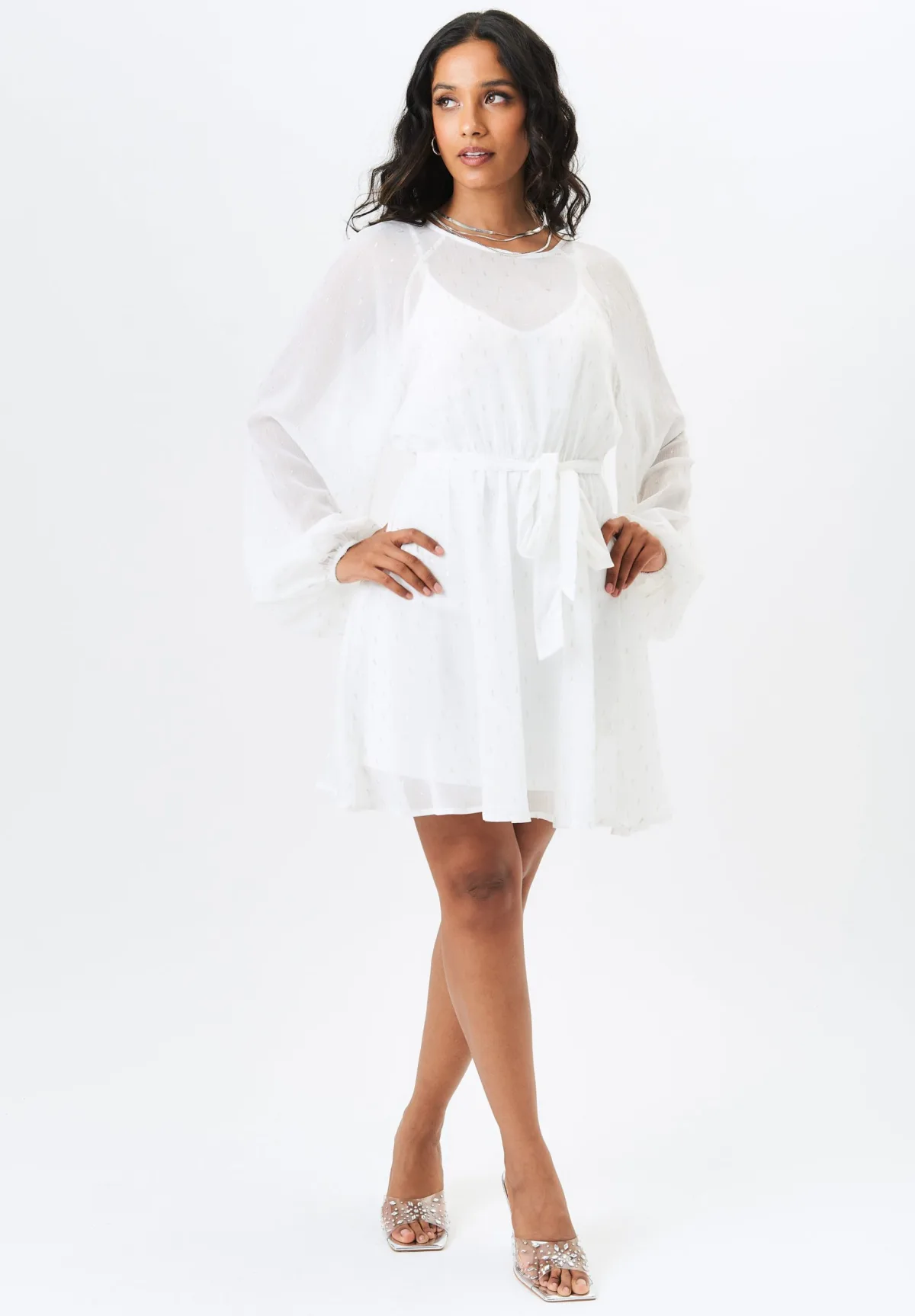 Maak een fashion statement in onze chiffon folie mini-jurk met lange mouwen. De lichtgewicht chiffonstof en de lange mouwen maken hem perfect voor elk seizoen, terwijl de foliedetails een vleugje verfijning toevoegen. Geef je stijl een boost met deze trendy mini-jurk.