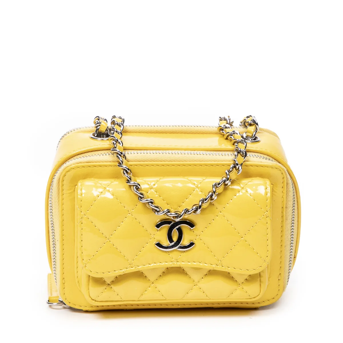 Chanel Tassen Mini Pocket Box Camera Case Schoudertas in de Geel Kalfsleer in de Zilver hardware. Het product is in In Perfecte Staat (AA). Afmetingen: 14x10x6.5 cm Inclusief accessoires: "Sticker; Card; Dustbag" BrandCo Paris vindt zeldzame artikelen in de beste staat voor ongelooflijke prijzen. Het is de moeite waard om geduldig te zijn! Koop met vertrouwen: alle artikelen van BrandCo Paris worden zorgvuldig geselecteerd en geverifieerd door ons team van experts. Alle artikelen worden geleverd met een certificaat van echtheid en verpakt door BrandCo Paris. Classificatietabel voor de conditie van het artikel: N (als nieuw) AA (perfecte staat) A (uitstekende staat) AB (zeer goede staat) B (goede/redelijke staat)