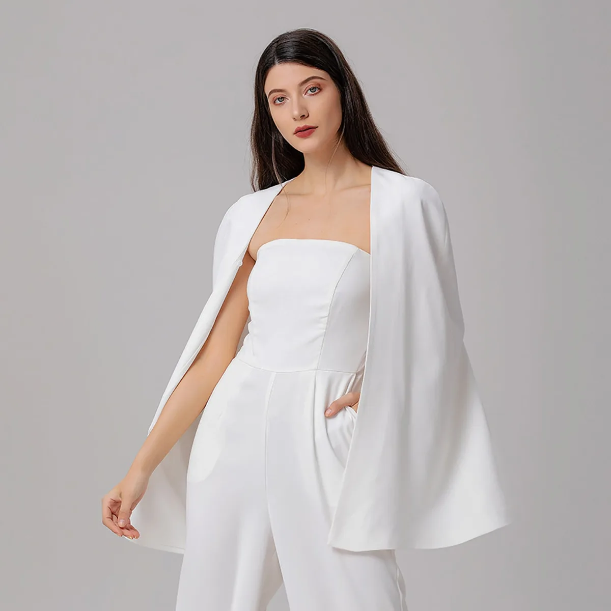 Deze minimalistische cape valt over de schouders en tot onder de heupen. Hij heeft een zeer verfijnde snit en is een perfecte accessoire voor verfijnde looks zoals avondjurken. Bovendien vormt hij een perfect geheel met onze "Minimalistische bustier jumpsuit". Geschikt voor het tussenseizoen en voor formele gelegenheden, cocktails en avonden. Productdetails: Vorm: wijd uitlopend Lengte: 76 cm Mouwloos Zonder sluiting, open te dragen