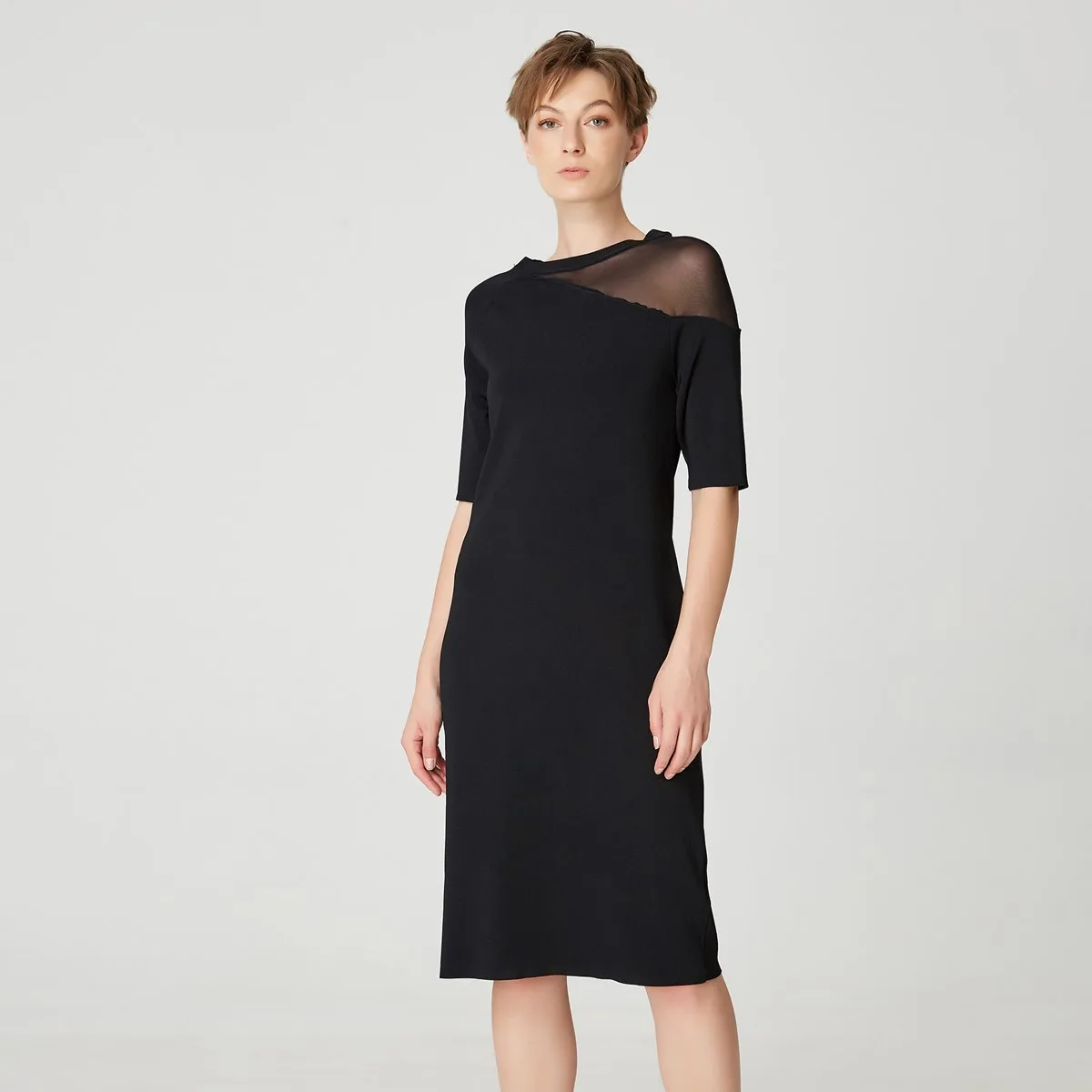 Een elegante en androgyne kamer; Asymmetrische rechte snit die subtiel de linkerschouder onthult met een dwarspaneel in mousseline. De rest van de jurk is een fijn geribbelde stretch -trui. Deze jurk neemt een "avontuurlijke" stijl aan die zo is geassocieerd met laarzen en een perfecto leren jas of biedt een meer vrouwelijke look met ballerina's of stiletto's. Productdetails: Vorm: recht Lengte: 95 cm; boven de knie 1/3 mouwen Ronde halslijn met zijrand Het model meet 1m75 en heeft een maat 38