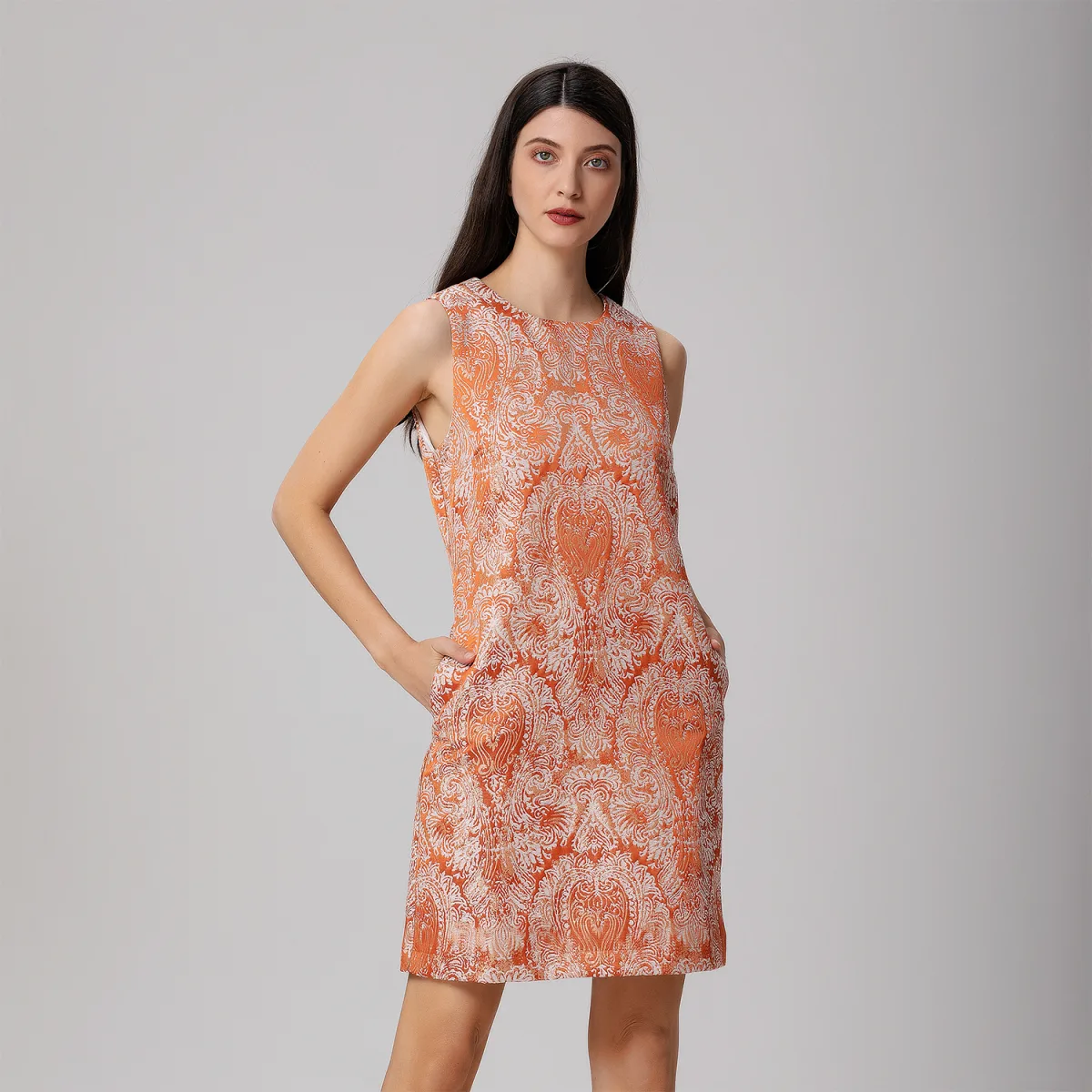 Een kort jurkje in een subtiele brokaatstof: het heeft een minimalistische, licht uitlopende snit, een ronde halslijn en steekzakken in de naad. Het kan worden gedragen met het bijbehorende jasje: een ensemble dat geschikt is voor semi-formele gelegenheden, voor een gepolijste look en een verfijnde stijl. Productdetails: Vorm: licht trapeziumvormig Lengte: 92 cm Ronde kraag Mouwloos Onzichtbare ritssluiting aan de linkerkant