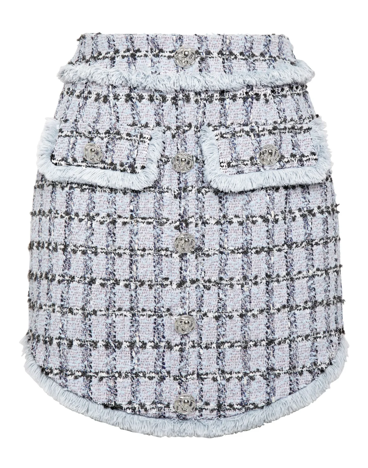 Chique & Rock stijl? Dan is deze rok echt iets voor jou. We hebben tweed opnieuw ontworpen volgens de stijl van Plein. Bekijk de details. Tweed van katoenmix Metalen juweelknopen Twee faux opgestikte zakken Onzichtbare ritssluiting aan de linkerkant Gerafelde zomen Binnenvoering Asymmetrische onderkant