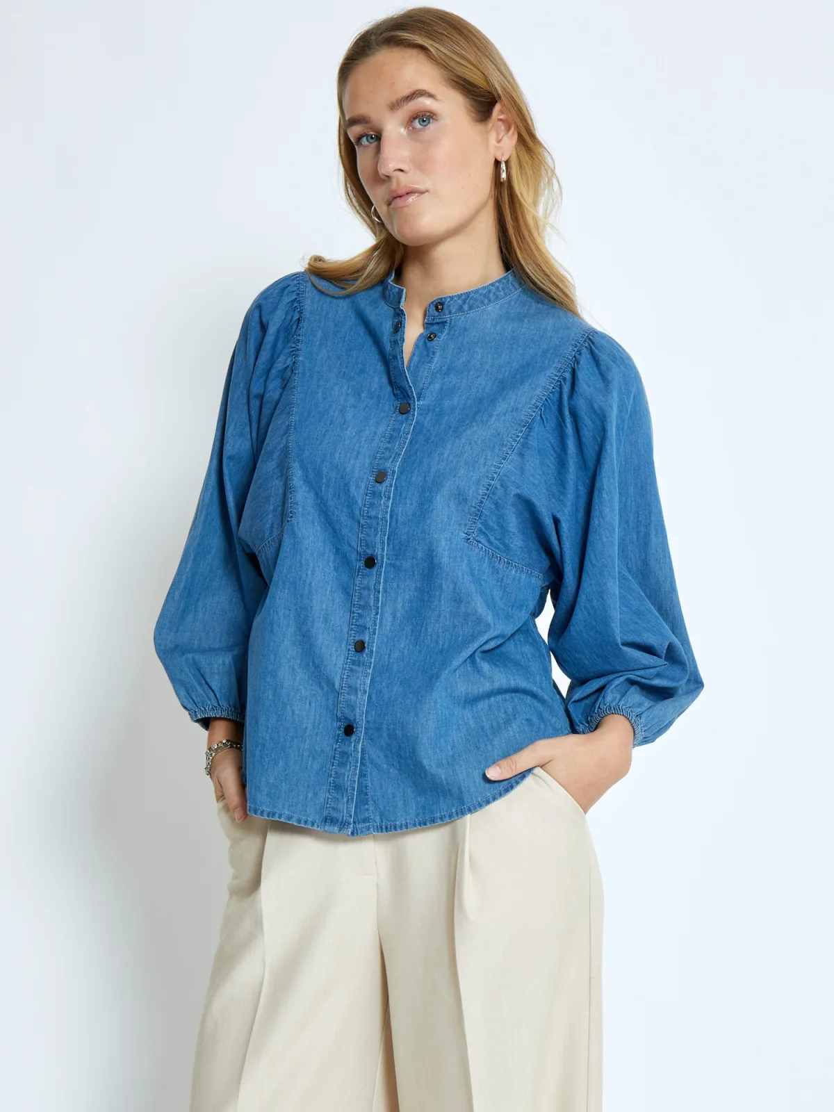 Blouse type: Klassieke blouse; Design: Gevoerde zoom/rand, Pofmouwen; Type sluiting: Knoopsluiting; Materiaal: Denim; Motief: Effen; Kraag: Opstaande kraag; Details: Gedrapeerd; Extra's: Gewassen effect; Pasvorm: Normale pasvorm; Armlengte: Lange mouw; Lengte: Normale lengte
