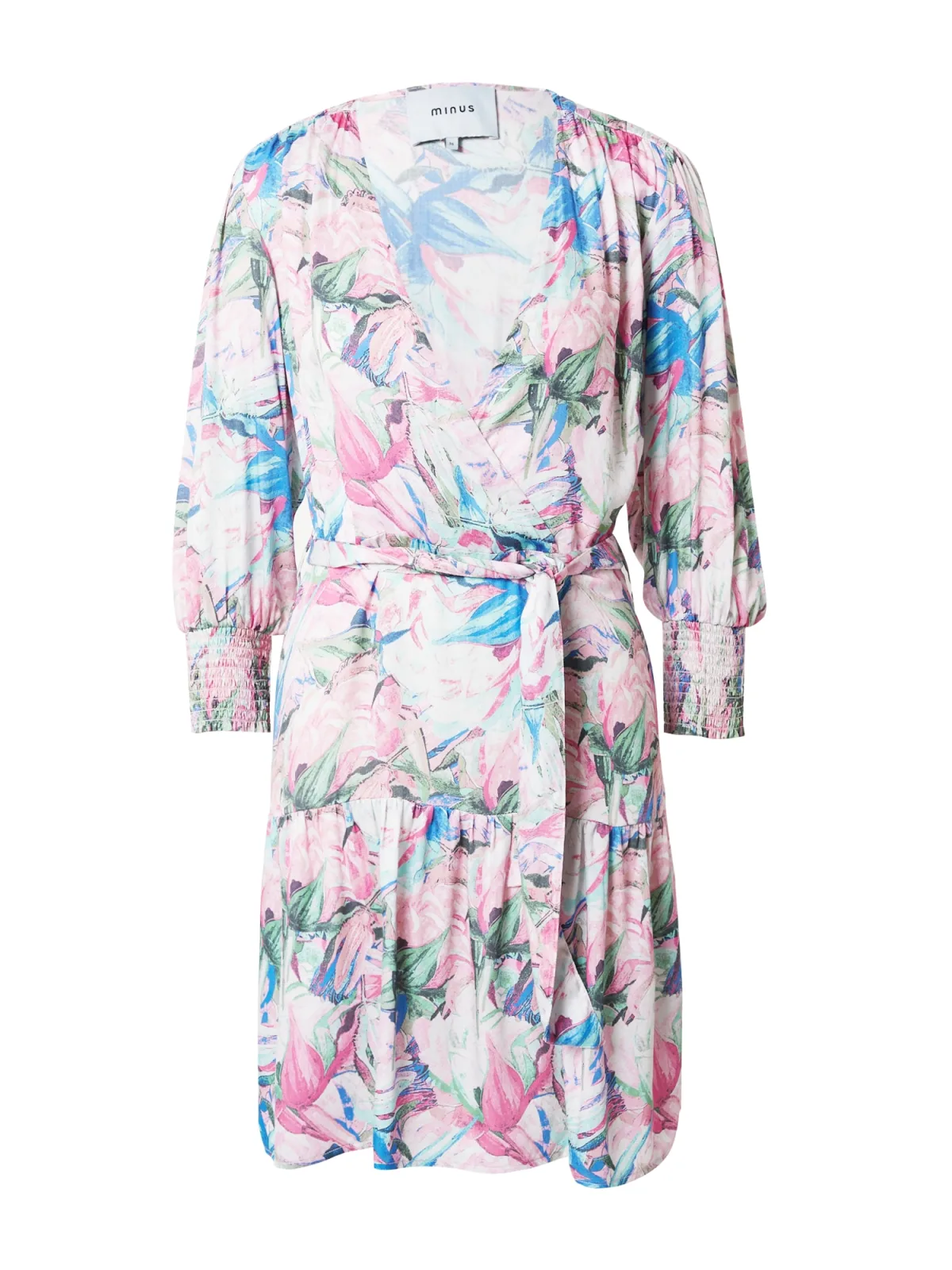 Design: Gevoerde zoom/rand, Flare, Wikkel-look, Om te knopen/binden; Halstype: V-hals; Motief: Bloemenprint; Details: Volant, Gedrapeerd; Extra's: All-over patroon, Biezen, Lichte stof, Riemlussen; Lengte: Kort/mini; Pasvorm: Normale pasvorm; Armlengte: Driekwart mouw
