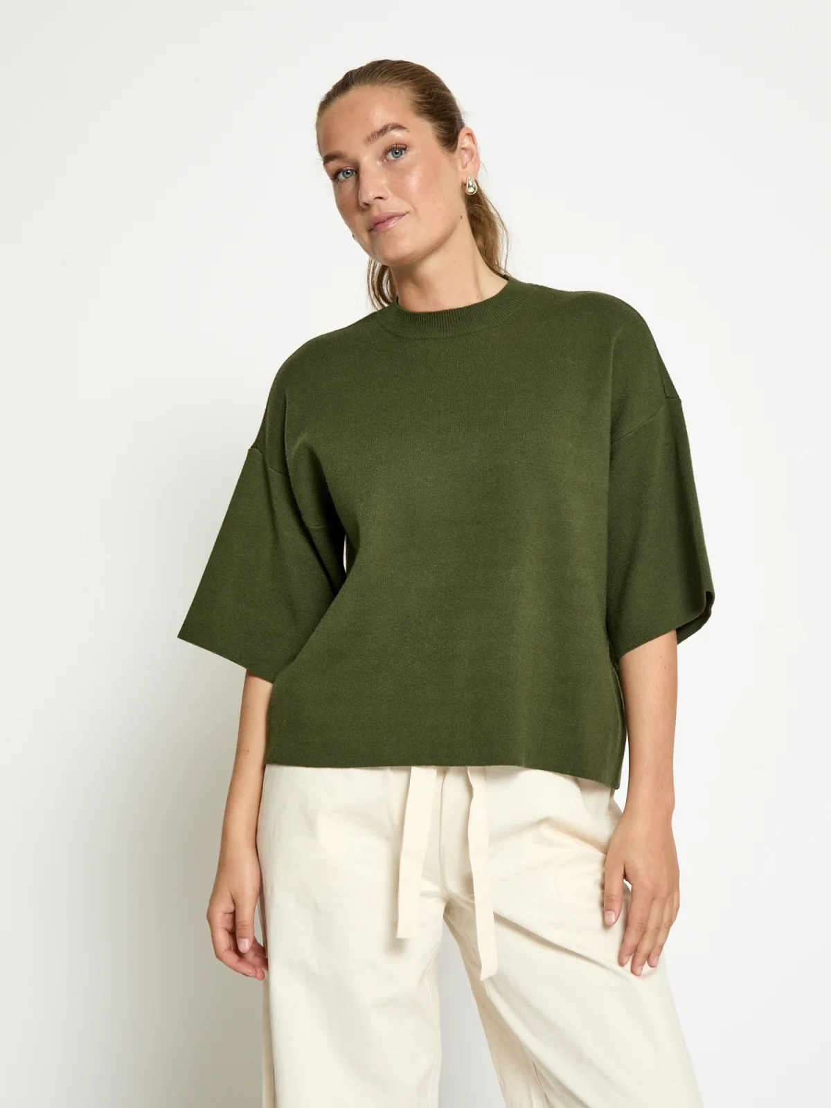 Design: Geribbelde kraag, Overcut schouder; Materiaal: Knitwear; Halstype: Opstaande kraag; Motief: Effen; Soort bandjes: Normale bandjes; Extra's: Voelt zacht aan; Pasvorm: Losse pasvorm; Armlengte: Halve mouw; Lengte: Normale lengte
