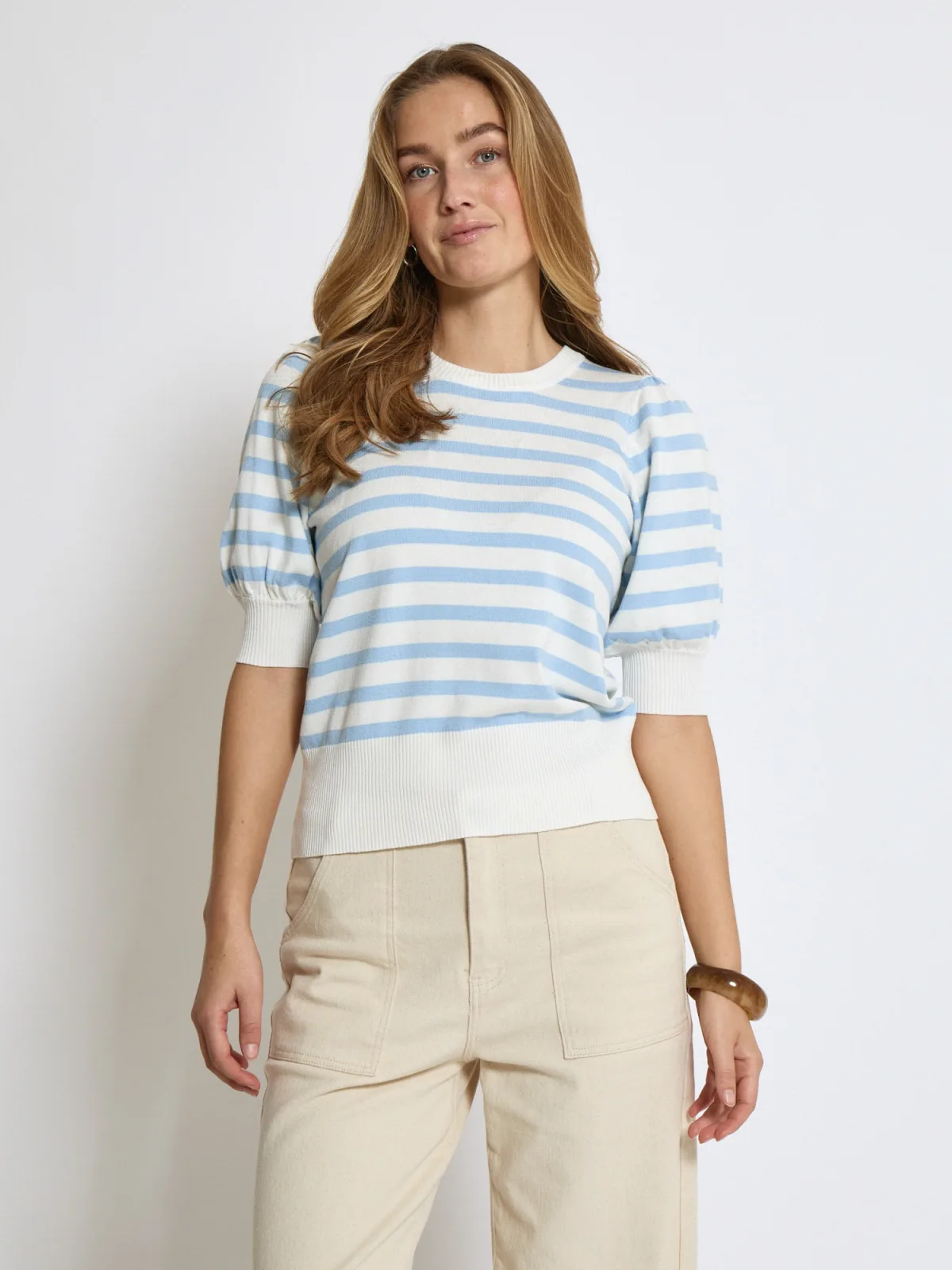 Design: Pofmouwen; Materiaal: Knitwear; Halstype: Ronde hals; Motief: Gestreept; Soort bandjes: Normale bandjes; Details: Gedrapeerd; Extra's: Fully fashioned; Pasvorm: Normale pasvorm; Armlengte: Halve mouw; Lengte: Normale lengte