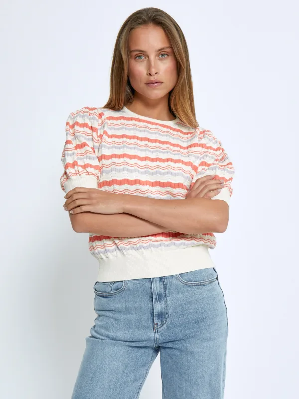 Design: Pofmouwen, Geribd ceintuurtje; Materiaal: Knitwear; Halstype: Ronde hals; Details: Gedrapeerd, Mesh; Extra's: All-over patroon, Fully fashioned; Pasvorm: Normale pasvorm; Armlengte: Kwartmouw; Lengte: Normale lengte