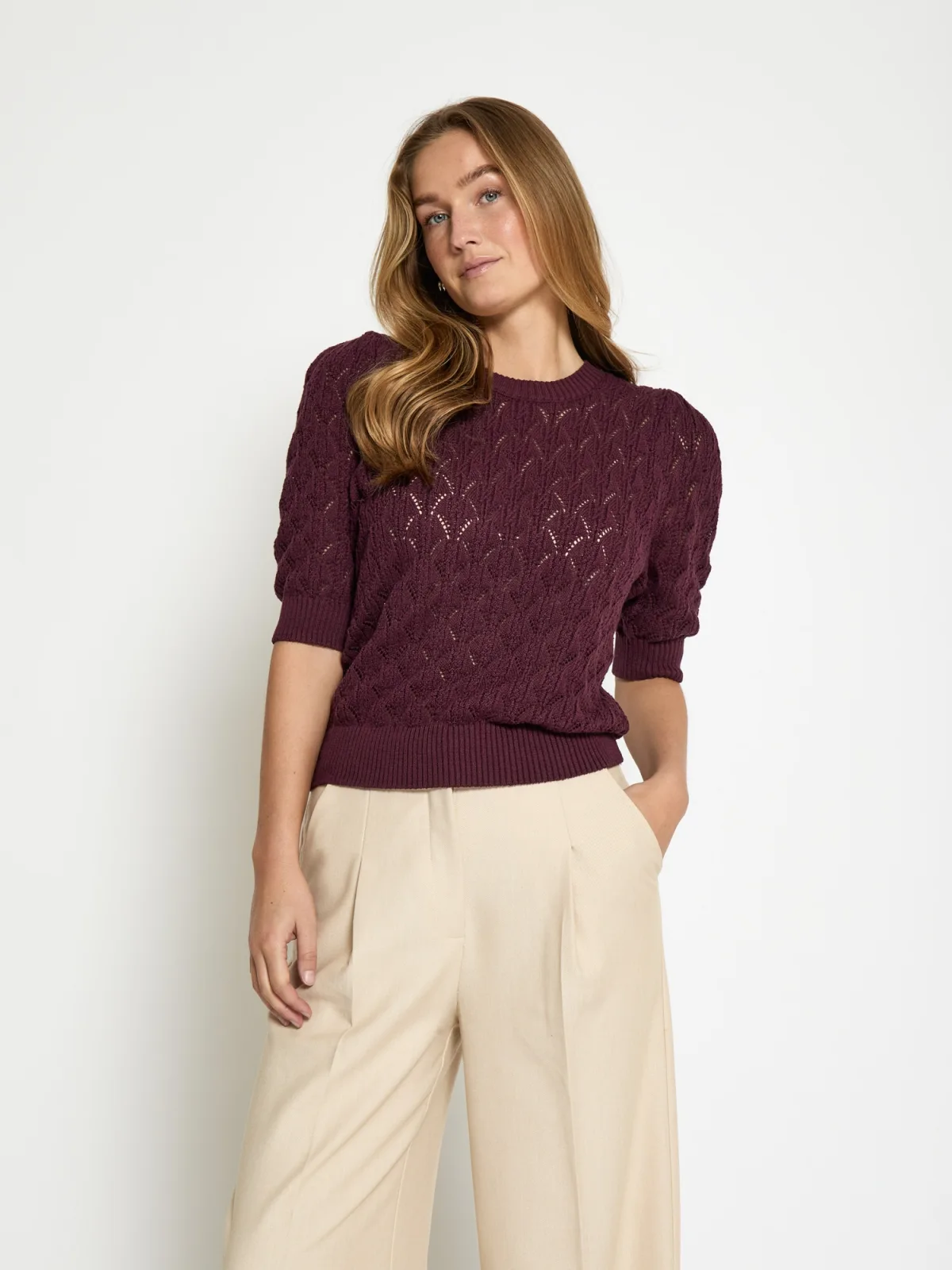 Design: Geribbelde kraag, Geribd ceintuurtje; Materiaal: Knitwear; Halstype: Ronde hals; Motief: Effen; Details: Mesh; Extra's: Met textuur, Voelt zacht aan; Pasvorm: Normale pasvorm; Armlengte: Halve mouw; Lengte: Normale lengte