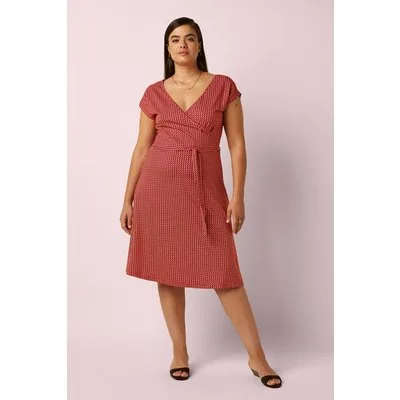 “Turn up the heat, keep it classy.” Deze zomerse en comfortabele jurk heeft een aansluitend lijfje met een elegante vaste overslag, speelse kapmouwtjes en een afneembaar striklintje dat je taille prachtig accentueert. Ze is uitgevoerd in een soepele en stretchy EcoVero viscosemix in chilirood, met een geometrische ruitjesprint in crème, donkerblauw en groen. * A-lijn * Kapmouwtjes * V-halslijn met vaste overslag * V-rug * Afneembare striklint * Geen rits of knopen * Valt bij een lengte van 1,70 m net over de knie