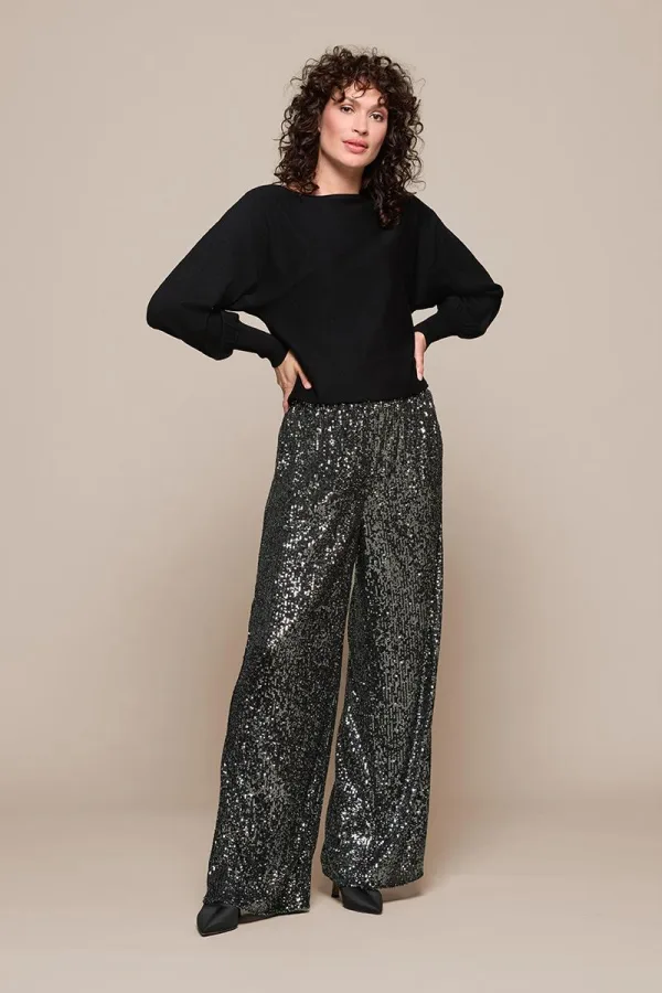 Creëer een sprankelende feestlook met de Mira paillettenbroek van Mart Visser in een unieke mix van grijs en groen. De fonkelende pailletten op een zwarte basisstof geven de broek een luxueuze en moderne uitstraling. De elastische tailleband garandeert een comfortabele pasvorm, terwijl de vloeiende rechte pijpen zorgen voor een flatterend en elegant silhouet. Dit ontwerp combineert moeiteloos draagcomfort met feestelijke allure, ideaal voor gala’s, diners en stijlvolle avondgelegenheden. Voor een complete ton-sur-ton outfit draag je de broek met de bijpassende blouse. Liever wat meer verfijning? Kies dan voor een zijdeachtige blouse en elegante hakken. Wie houdt van een moderne twist kan de broek combineren met een fijne coltrui of basic top en sneakers. Afstylen doe je met subtiele accessoires en een clutch in zachte tinten, zodat de pailletten volledig tot hun recht komen. Door de hoogwaardige afwerking en duurzame materialen blijft deze broek seizoen na seizoen een elegante keuze.