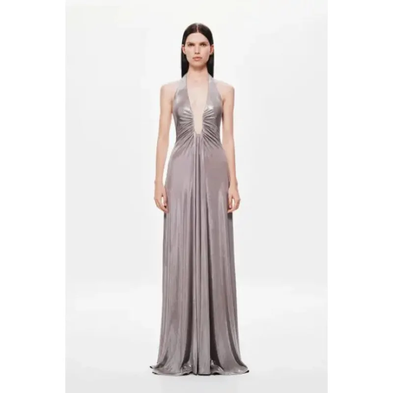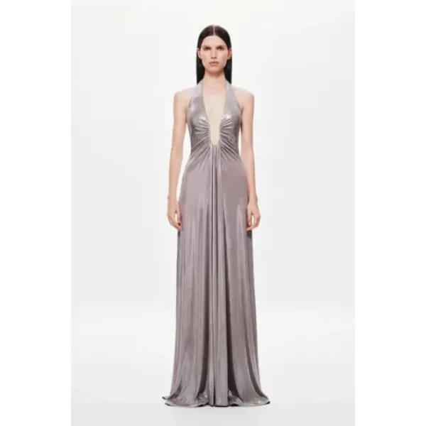 Deze nieuwe signatuur van het merk is innovatief, met een diep uitgesneden halterhalslijn die is afgewerkt met een verstelbare beugel en een watervalvormige ceintuur. Jennifer verlegt de grenzen met haar lange, strakke lijnen die het decolleté van de drager subtiel blootleggen.
