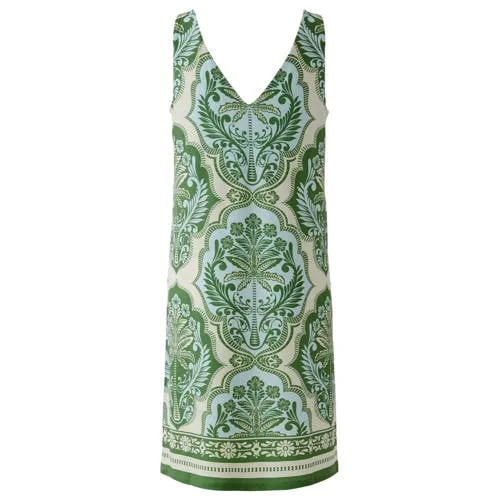 Frisse kleuren en een getailleerde snit komen samen in deze mouwloze korte jurk met all over print van Miss Lagotte. De jurk heeft een all over print in groen, blauw en ecru en valt kort, waardoor je benen goed zichtbaar zijn. De V-hals zorgt voor een open halslijn en de soepele stof met lichte stretch volgt je bewegingen op een natuurlijke manier. Ideaal voor lentedagen waarop je zonder veel moeite aangekleed en compleet de deur uit wilt.Details die het verschil maken Korte damesjurk uit de Boutique collectie van Miss Lagotte All over print in groen, blauw en ecru voor een opvallende look Mouwloos model, prettig voor de warmere seizoenen V-hals die het hals- en decolletégebied vrij laat Gemaakt van een zachte, soepele stof met 8% elastaan voor extra bewegingsvrijheid Zonder sluiting, je trekt de jurk eenvoudig over het hoofd aan Glad silhouet zonder zakken voor een rustige, gestroomlijnde uitstralingVoor lentedagen vol gemakDeze korte jurk is een praktische keuze voor lentedagen waarop je iets lichts en luchtigs zoekt. Geschikt voor een dag in de stad, een etentje of een bezoek aan vrienden. Met een vest of denim jasje en sneakers oogt de jurk casual, met sandalen of hakken krijgt de outfit een meer geklede uitstraling.Miss Lagotte: verzorgd en eigentijdsMiss Lagotte staat voor eigentijdse damesmode met aandacht voor pasvorm en detail. De collecties zijn afgestemd op dagelijks draagplezier, met modellen die prettig zitten en een nette indruk geven. Zo voeg je met iedere jurk van Miss Lagotte eenvoudig een passende optie toe aan je garderobe.Een jurk die je snel uit de kast pakt wanneer je iets lichts en luchtigs wilt dragen.