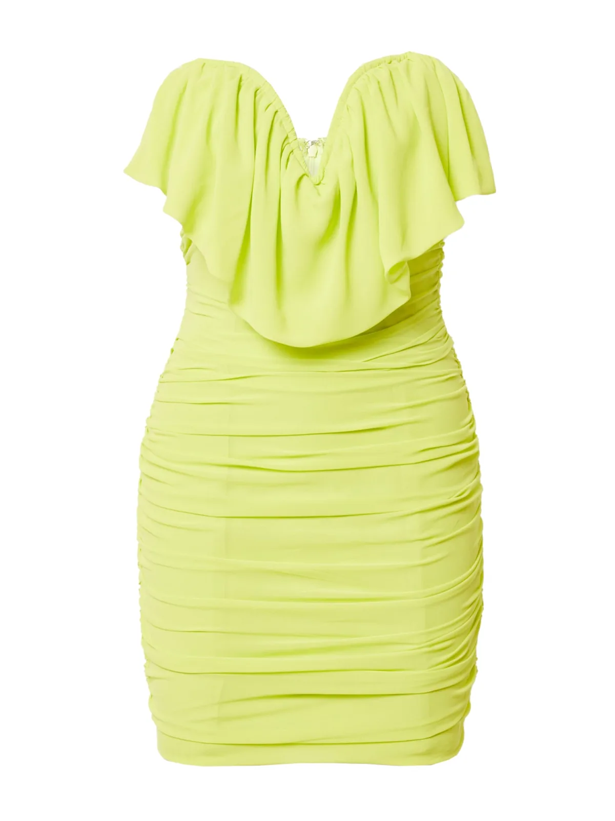 Design: Gevoerde zoom/rand, Rug rits, Diepe snit/decolleté; Materiaal: Chiffon; Motief: Effen; Soort bandjes: Bandeau; Details: Volant, Gedrapeerd; Extra's: Op staal naden, Gladde stof; Lengte: Kort/mini; Pasvorm: Aansluitende pasvorm; Armlengte: Mouwloos