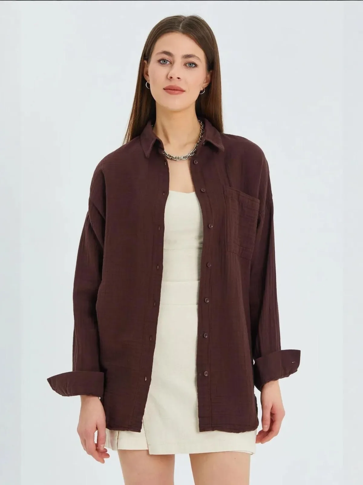 Blouse type: Klassieke blouse; Design: 1-knoops manchetten, Gevoerde zoom/rand, Overcut schouder, Borstzak; Type sluiting: Knoopsluiting; Materiaal: Mousseline; Halstype: Ronde hals; Motief: Effen; Kraag: Kentkraag; Details: Plooien; Extra's: Op staal naden, Crinkle look; Pasvorm: Losse pasvorm; Armlengte: Lange mouw; Lengte: Lange pasvorm