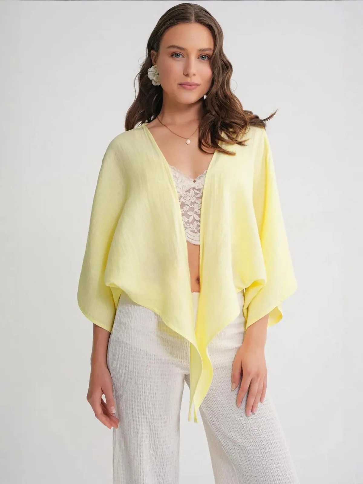 Blouse type: Klassieke blouse; Design: Vleermuismouwen, Om te knopen/binden; Materiaal: Mousseline; Motief: Effen; Kraag: Zonder kraag; Extra's: Voelt zacht aan; Pasvorm: Losse pasvorm; Armlengte: Driekwart mouw; Lengte: Korte pasvorm