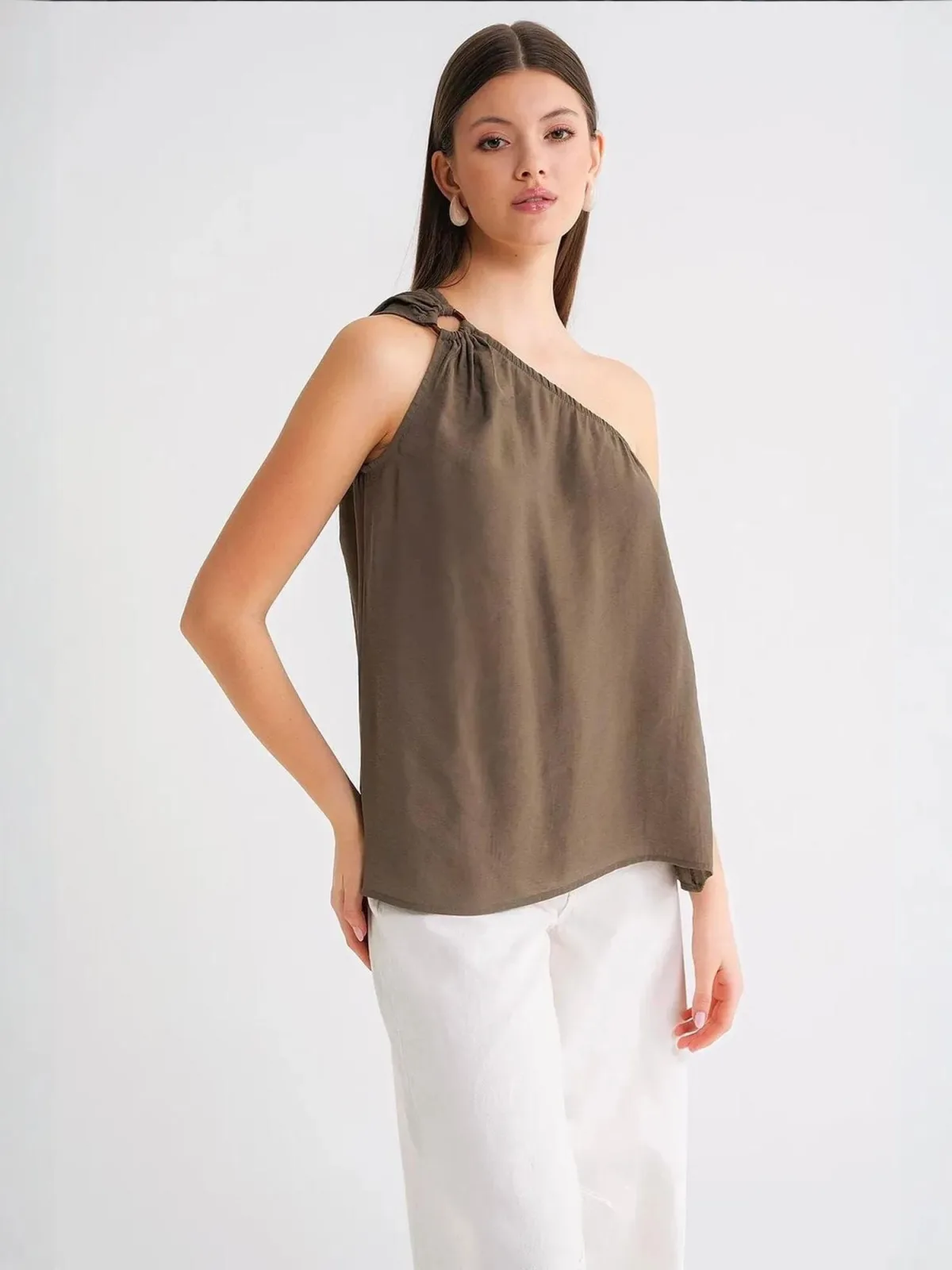 Blouse type: Blouseshirt; Design: A-lijn, Elastische inzetstukken; Halstype: Uitgesneden hals; Motief: Effen; Kraag: Zonder kraag; Soort bandjes: One-shoulder; Details: Gedrapeerd; Extra's: Op staal naden, Gladde stof; Pasvorm: Normale pasvorm; Armlengte: Mouwloos; Lengte: Normale lengte