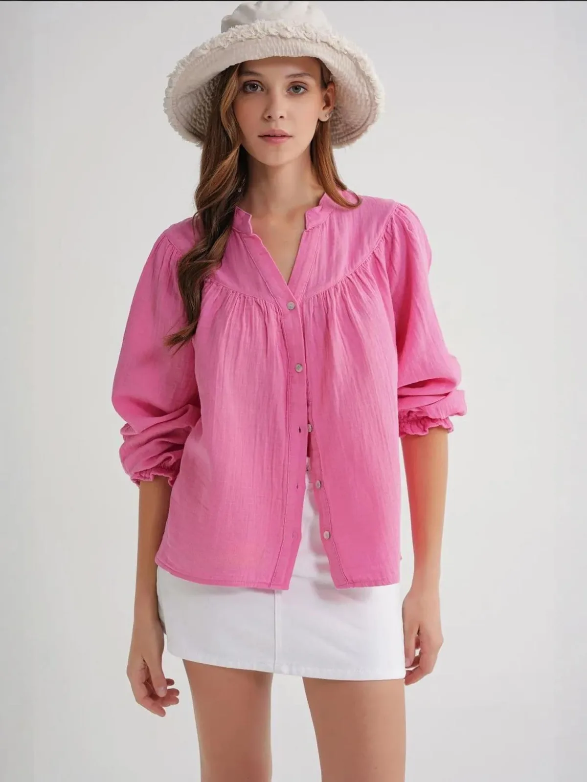Blouse type: Klassieke blouse; Design: Gevoerde zoom/rand, Elastische taille/zoom, Pofmouwen; Type sluiting: Knoopsluiting; Materiaal: Katoen; Motief: Effen; Kraag: Tuniek kraag; Details: Ruches, Gedrapeerd; Extra's: Op staal naden; Pasvorm: Normale pasvorm; Armlengte: Lange mouw; Lengte: Normale lengte