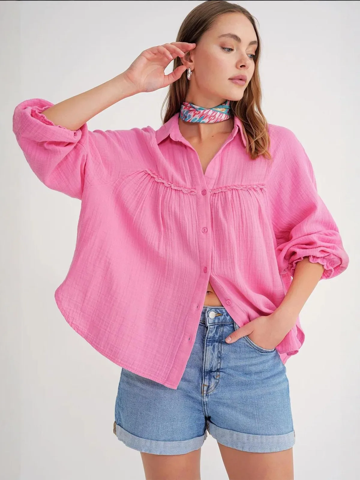 Blouse type: Klassieke blouse; Design: Gevoerde zoom/rand, Elastische taille/zoom, Pofmouwen, Overcut schouder; Type sluiting: Knoopsluiting; Materiaal: Katoen; Motief: Effen; Kraag: Kentkraag; Details: Ruches, Gedrapeerd; Extra's: Op staal naden; Pasvorm: Losse pasvorm; Armlengte: Lange mouw; Lengte: Normale lengte