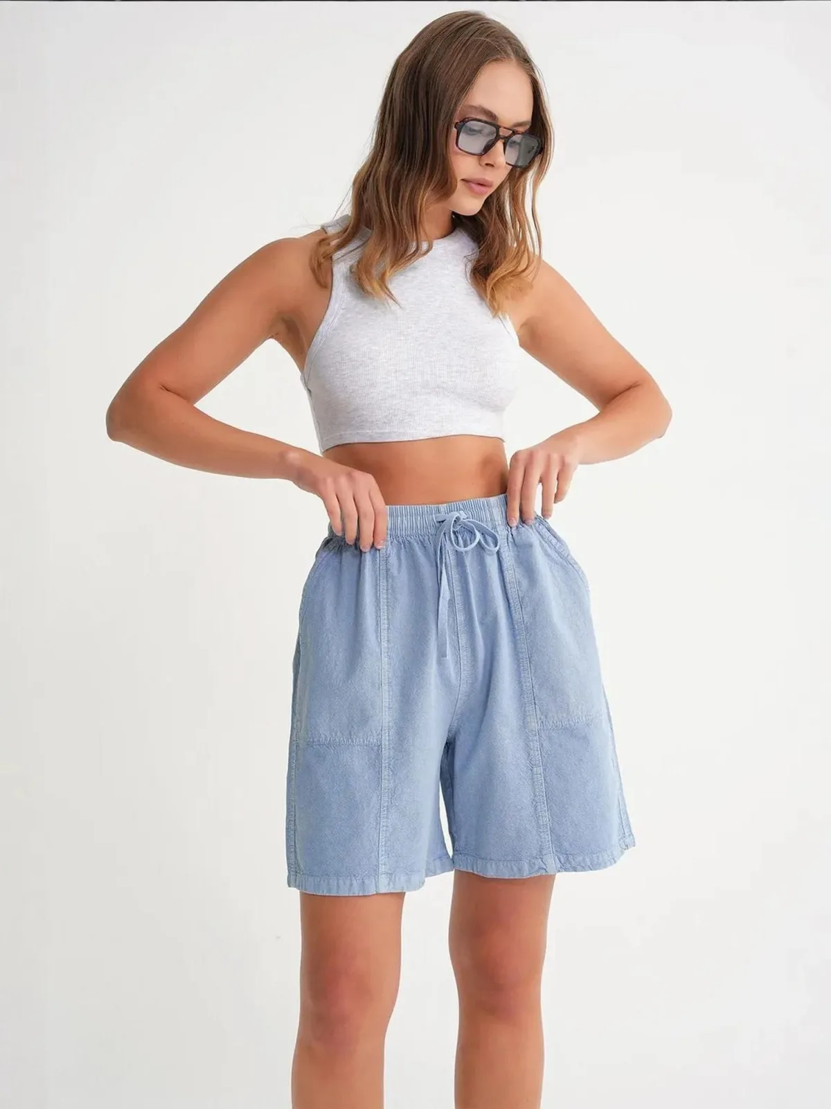 Design: Elastische taille/zoom, Met band/snoer, Zakken aan de zijkant; Materiaal: Katoen; Motief: Effen; Details: Gedrapeerd; Extra's: Op staal naden; Lengte: Kort/mini; Pasvorm: Regular; Taillehoogte: High waist