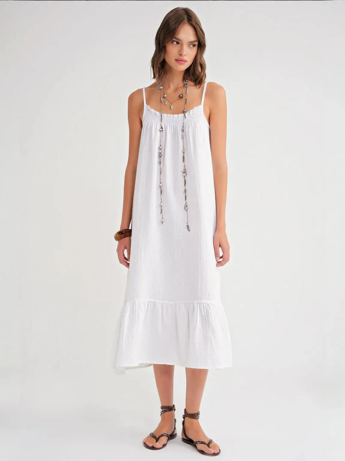 Design: Gevoerde zoom/rand; Materiaal: Mousseline; Halstype: Ronde hals; Motief: Effen; Soort bandjes: Spaghettibandjes; Details: Ruches, Volant, Gedrapeerd; Extra's: Voelt zacht aan; Lengte: 3/4 lengte; Snit: Uitlopend; Pasvorm: Losse pasvorm; Armlengte: Mouwloos
