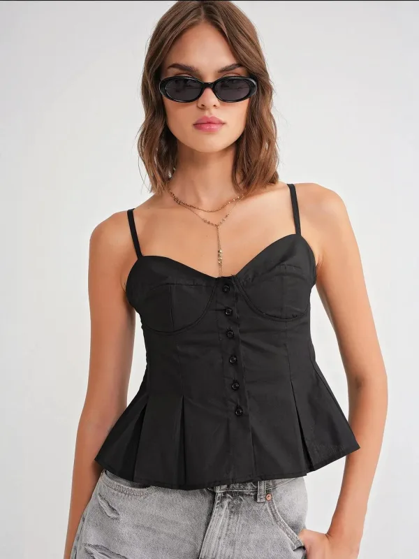 Blouse type: Blouseshirt; Design: Gevoerde zoom/rand; Materiaal: Katoen; Motief: Effen; Soort bandjes: Spaghettibandjes; Details: Plooien; Extra's: Op staal naden; Pasvorm: Normale pasvorm; Armlengte: Mouwloos; Lengte: Normale lengte