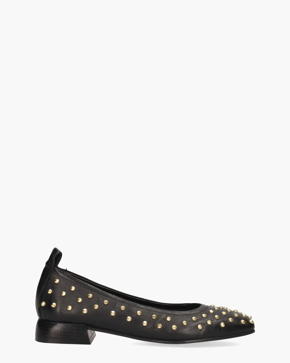 Deze zwarte ballerina’s L79102 van het Italiaanse merk MJUS combineren stijl en comfort. De soepele leren bovenzijde is voorzien van een subtiele structuur en is bezaaid met gouden studs wat de schoenen een verfijnde uitstraling geeft. De binnenkant is ook volledig in leer met een vast voetbed uitgevoerd, wat zorgt voor heerlijk