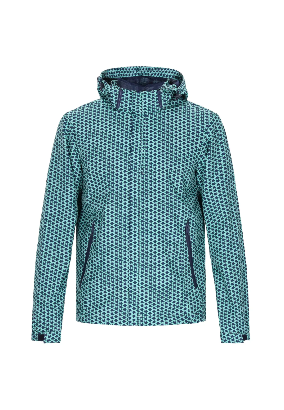 Dit jack met capuchon combineert stijl en functionaliteit met een opvallend patroon. De doorlopende ritssluiting aan de voorkant en twee zakken met ritssluiting bieden praktisch gemak en veilige opslag. De elastische manchetten aan de lange mouwen zorgen voor een perfecte pasvorm, terwijl de verstelbare trekkoorden aan de capuchon voor individueel comfort zorgen. Jas