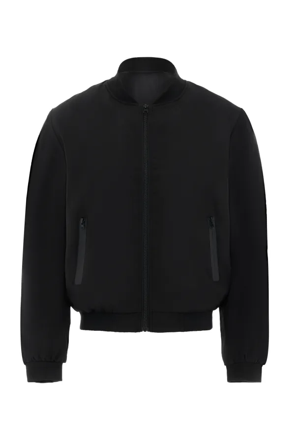 Dit bomberjack heeft een volledige ritssluiting aan de voorkant en een opstaande kraag. De elastische manchetten aan de lange mouwen zorgen voor extra comfort, terwijl de zakken met ritssluiting op de taille en linkermouw praktische opbergmogelijkheden bieden. Het eenvoudige ontwerp zonder zichtbare patronen of versieringen geeft het een elegante en moderne uitstraling - ideaal voor iedereen die op zoek is naar een minimalistisch jasje. Jas