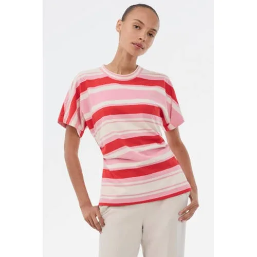 Fris je garderobe op met dit Modström dames T-shirt uit de Studio collectie. Het shirt heeft een moderne streepprint in rood, roze en ecru en zorgt daarmee direct voor een levendige, maar rustige uitstraling. De driekwart mouwen en ronde hals geven een tijdloos silhouet dat gemakkelijk te combineren is met je favoriete items.Details die het verschil maken Streepprint in rood, roze en ecru voor een speels, fris effect Driekwart mouwen met rechte mouwinzet voor een nette, ontspannen look Ronde hals die mooi aansluit zonder strak te voelen Gemaakt van een stof met katoen, zacht en prettig voor elke dag Single item, goed te gebruiken als basisstuk in je kledingkastElke dag eenvoudig combinerenDit T-shirt is geschikt voor lentedagen waarop je iets luchtigs wilt dragen dat net wat gekleder oogt dan een basic top. De strepen combineren makkelijk met een jeans, een rechte broek of een rok. Sneakers, loafers of sandalen eronder en de outfit is compleet.Modström: scandinavische eenvoud met karakterModström staat bekend om moderne collecties met heldere lijnen en doordachte kleuren. De ontwerpen sluiten aan bij een dagelijkse garderobe waarin stijl en comfort samenkomen. Zo kies je voor een merk dat toegankelijke en betrouwbare mode biedt.Een gestreept T-shirt dat je seizoen na seizoen eenvoudig combineert met verschillende outfits.