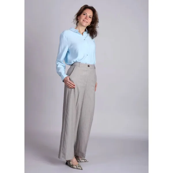 De Modstrom MeridaMD pants is een stijlvolle en veelzijdige toevoeging aan je garderobe. Deze grijze krijtstreep pakbroek heeft een middelhoge taille, wijd uitlopende pijpen en persplooien voor een elegante, tijdloze look. De ritssluiting, zijzakken en een subtiel paszakje aan de achterkant maken deze broek zowel praktisch als stijlvol. Gemaakt van een hoogwaardige polyester-rayon mix met stretch (4% elastaan), biedt deze broek een comfortabele pasvorm die de hele dag mooi in vorm blijft. Product details: Grijs Middelhoge taille Wijd uitlopende pijpen Persplooien Krijtstreep Steekzakken Rits- en knoopsluiting Materiaal: 80% polyester, 16% rayon, 4% elastaan Valt normaal op maat Het model is 176 cm lang en draagt maat S
