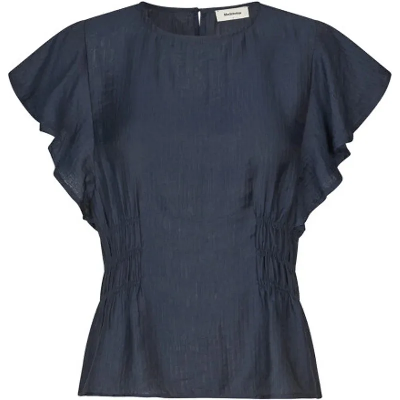 Voeg een elegante touch toe aan je outfit met de Modström NixonMD top. Deze verfijnde donkerblauwe top is gemaakt van een duurzame mix van TENCEL™ Lyocell, LENZING™ ECOVERO™ Viscose en nylon. De zachte, licht glanzende stof valt soepel rond het lichaam en voelt heerlijk luchtig aan. De ruches op de korte mouwen en het smockdetail in de taille geven de top een vrouwelijke, flatterende vorm. De ronde hals met subtiele knoopsluiting aan de achterzijde maakt het geheel af. Perfect te combineren met zowel een jeans als een rok voor een stijlvolle, alledaagse look. Product details: Merk: Modström Modelnaam: NixonMD Top Kleur: Donkerblauw Materiaal: 47% LENZING™ ECOVERO™ Viscose, 35% TENCEL™ Lyocell, 18% nylon Ronde hals met knoopsluiting Korte mouwen met ruches Smockdetail in de taille Soepelvallend en ademend Valt normaal op maat