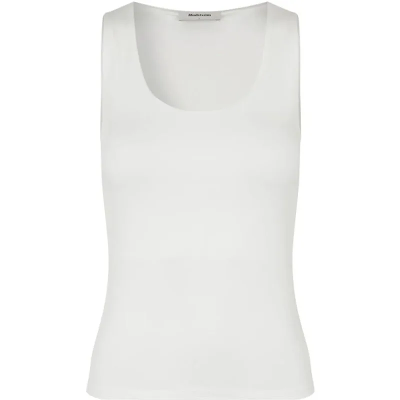 Witte aansluitende basic top Hima van het merk Modstrom. De top met stretch heeft brede bandjes en een diepe ronde hals gemaakt in gerecyclede kwaliteit. De witte top heeft een strak silhouet met borstversterking. Materiaal: 95% gerecycled polyester, 5% elastaan.