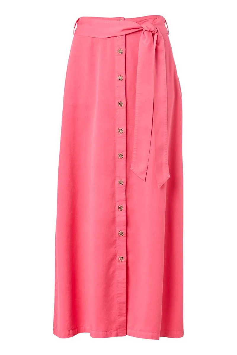 Deze chique rok van Mart Visser is vervaardigd uit een soepel vallende Tencel-stof en heeft een knoopsluiting aan de voorkant. De rok valt net boven de kuit en heeft een prachtige A-lijn pasvorm. De tailleband is uitgerust met lussen waar je de strikceintuur doorheen kunt halen om een extra vrouwelijk accent toe te voegen. Met comfortabele steekzakken en verkrijgbaar in een prachtige roze kleur, straalt deze rok niet alleen schoonheid uit, maar is ook verantwoord geproduceerd vanwege het gebruik van duurzame Tencel-stof. Combineer deze rok perfect met de Feline blouse in dezelfde kwaliteit en kleur voor een klassieke look, of draag hem met een wit T-shirt voor een meer casual uitstraling.