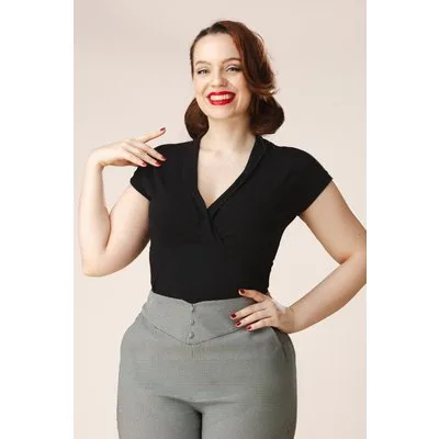 “Let’s go retro!” Deze top is uitgevoerd in een stretchy EcoVero viscosemix in zwart — zacht, duurzaam én heerlijk om te dragen. * V-hals met vaste overslag * Korte kapmouwtjes * Lang genoeg om op een normale heupbroek te dragen
