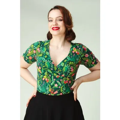 Wat een cutie, deze top! Ze is uitgevoerd in een luchtige en stretchy donkergroene biologische katoenmix met een kleurrijke print van speelse bloemen en bladeren, een milieuvriendelijkere variant die bovendien onder betere en veiligere arbeidsomstandigheden is geproduceerd, fijn voor jou én voor de planeet. * Vaste overslag * Korte mouwen * Lang genoeg om op een normale heupbroek te dragen