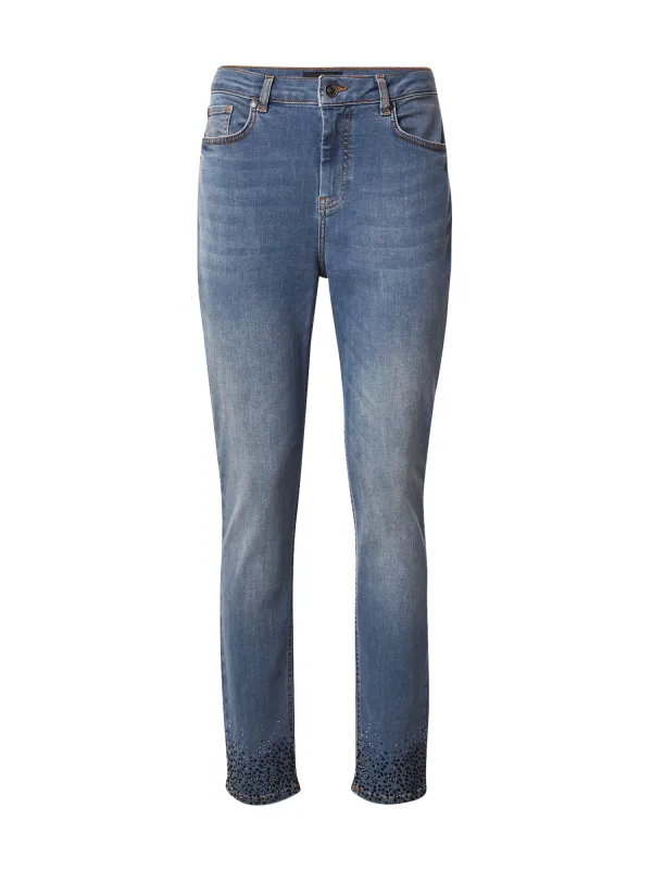 Design: 5-pocket-style; Type sluiting: Ritssluiting; Materiaal: Denim; Motief: Effen; Details: Sierstenen; Extra's: Met halfedelstenen, Glitterend, Riemlussen; Wassing: Light washed; Lengte: Lang/maxi; Pasvorm: Slimfit; Taillehoogte: High waist