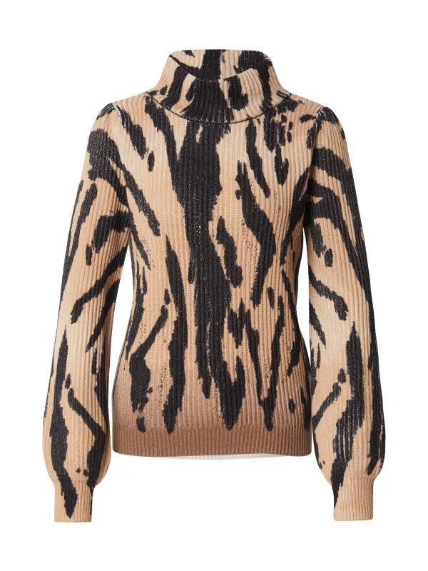 Design: Geribbelde kraag, Rechte zoom, Pofmouwen, Geribd ceintuurtje; Materiaal: Knitwear; Halstype: Opstaande kraag; Motief: Dierenprint; Details: Sierstenen, Gedrapeerd; Extra's: Met halfedelstenen, Glitterend, All-over patroon, Fully fashioned, Met textuur; Pasvorm: Normale pasvorm; Armlengte: Lange mouw; Lengte: Normale lengte