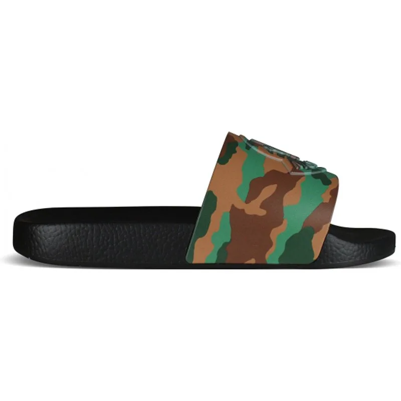 Zwarte Monlerc-slippers, Basile-model met groen en kaki camouflagepatroon.Bandje met Moncler-logo in reliëf.Open ronde neus.Zwarte rubberen gekerfde zool. Gemaakt in Italië.