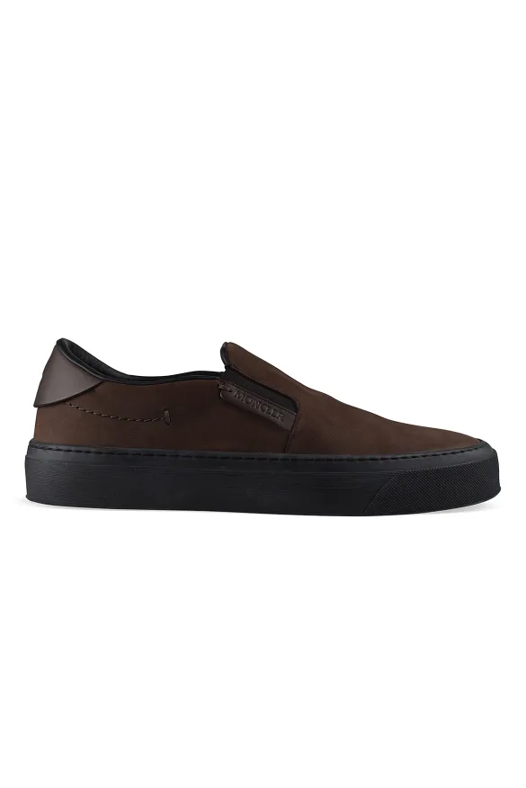 Monclub slip-on trainers Moncler van bruin nubuckleer.Leren label met reliëflogo op zichtbare zijde.Leren teller met reliëflogo.Slip-on stijl.Zwarte rubberen zool met logo.Made in Italy.