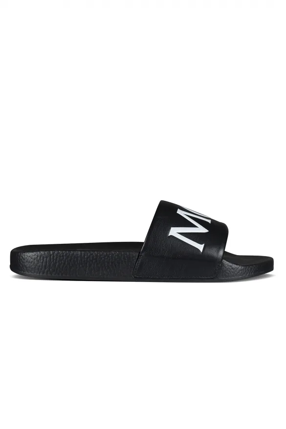 Zwarte Moncler-slippers.Wit logo op de zwartleren tong.Zwarte rubberen zool.Gemaakt in Italië.