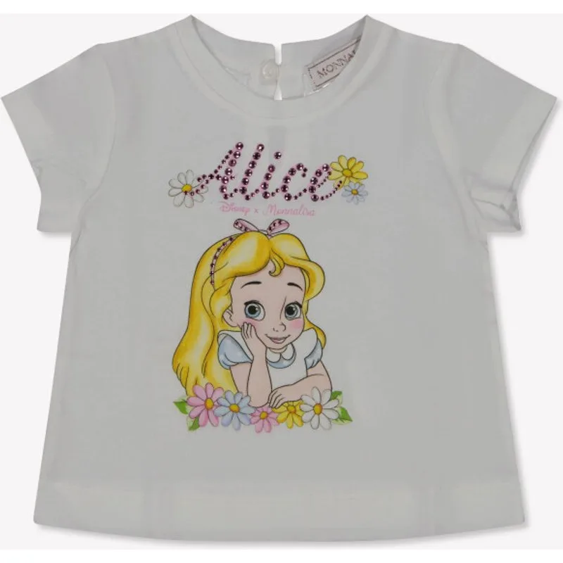 39E6105002 0099 WHITE/MULTICOLORE SS25x Disney Alice T-shirtwit/veelkleurigkatoenlichtgewicht jerseyenkele knoopsluiting aan de achterkantronde halskorte mouwenlogo-versieringillustratiestijl afdrukkenMONNALISA